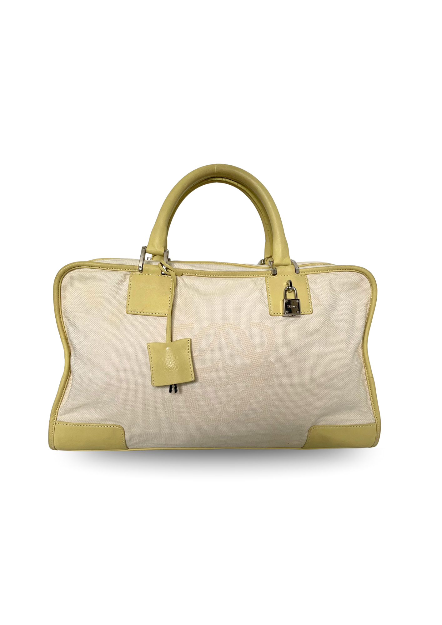 This pre-owned vintage LOEWE Amazona 36 Canvas Anagram Bag is crafted from canvas with soft yellow leather trim and subtle anagram jacquard detailing. A structured, medium-sized carryall with dual handles, it balances elegance and everyday function.